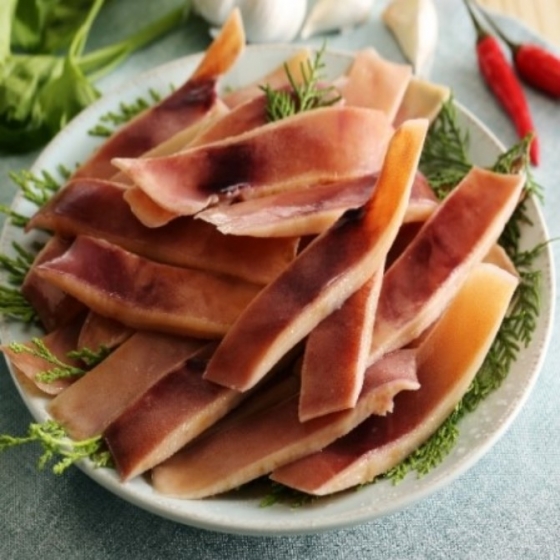 1.乾魷魚必須經過數月熟成後才進行水發,無須添加人工色素改變外觀。